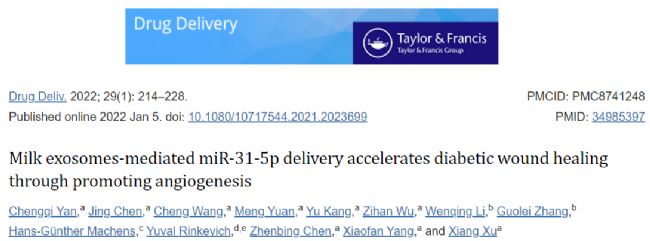 [1].Yan C, Chen J, Wang C, et al. Milk exosomes-mediated miR-31-5p delivery accelerates diabetic wound healing through promoting angiogenesis. Drug Deliv. 2022 Dec;29(1):214-228. doi: 10.1080/10717544.2021.2023699. PMID: 34985397; PMCID: PMC874124.