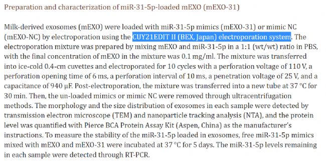 方法:使用CUY21EDITII來進(jìn)行miR-31-5p外泌體封裝
