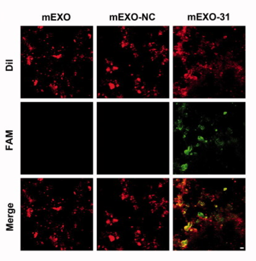 圖2:共聚焦圖像顯示miR-31-5p成功加載到mEXO中。紅色和綠色熒光分別代表mEXO和FAM標(biāo)記miR-31-5p模擬物